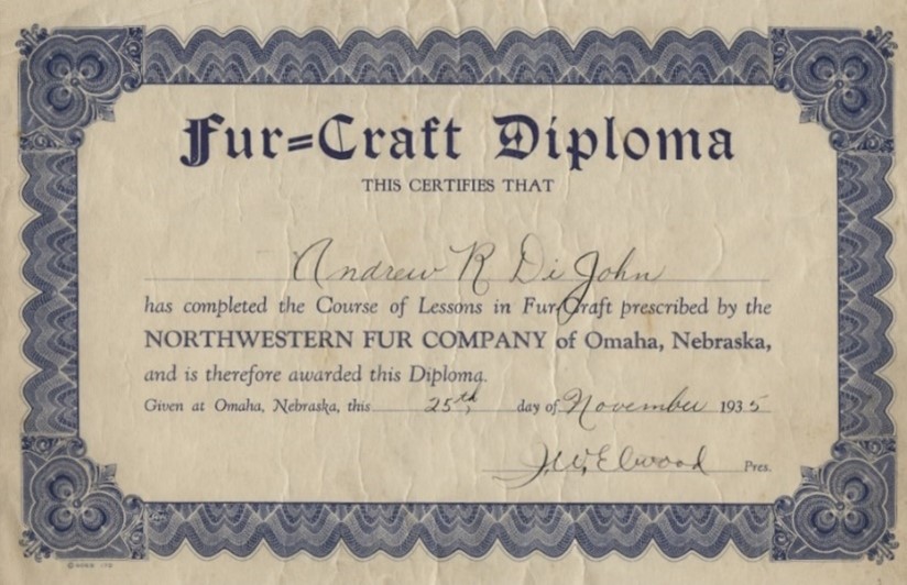In 1935, Andy earned a Fur-Craft Degree from The Northwestern Fur Co. in Omaha, Nebraska.