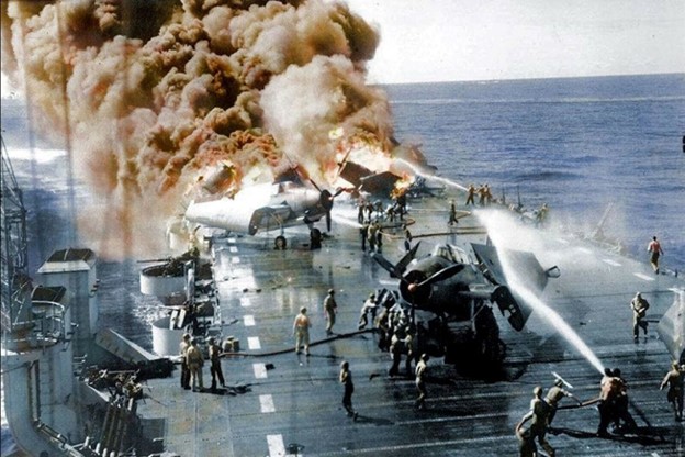 On October 30th, 1944 just after noon, a Japanese kamikaze dove on the USS Belleau Wood & crashed into the light carrier’s flight deck striking 11 fully loaded Hellcats. The crew battled fires from burning explosions and extended fires for hours.