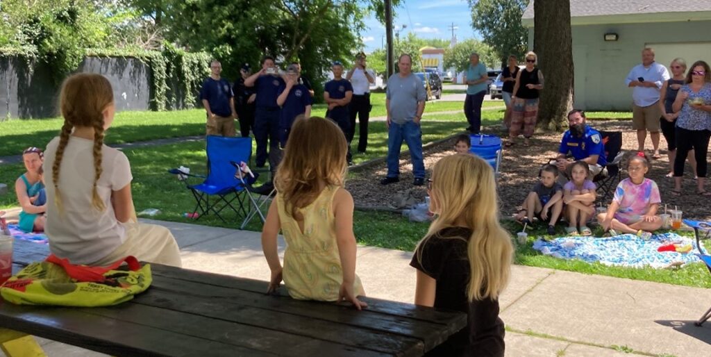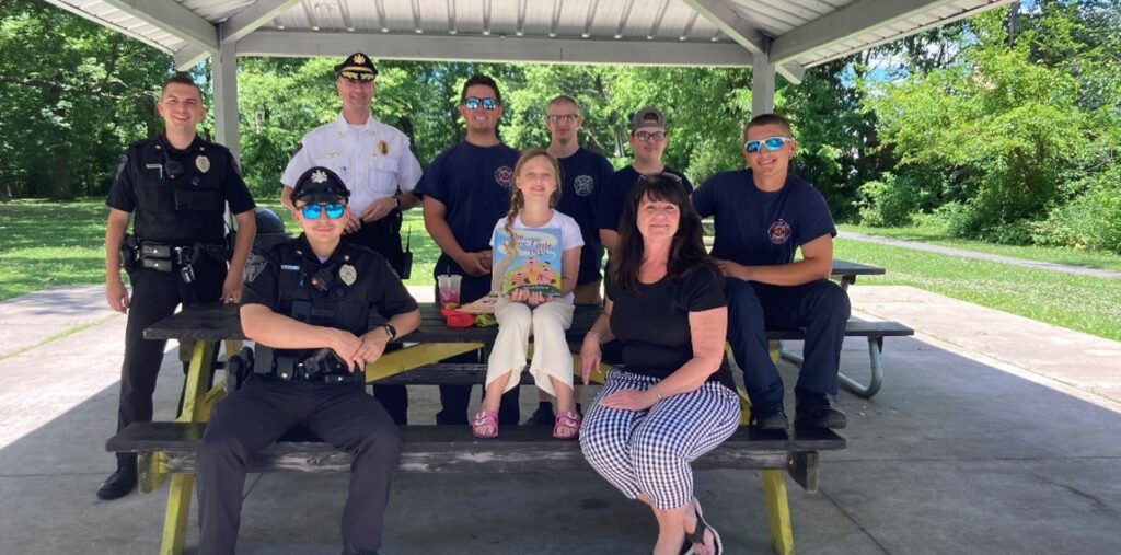 Olivia’s Story Time was in conjunction with the Middletown Free Library’s “Books on Blankets” Program where Olivia Raport, granddaughter of Building Manager Harry Swayngim, read to pre-schoolers. Olivia is supported by Police Chief Vice, Police Officers, Fire Fighters, and Mayor Denise Leslie.