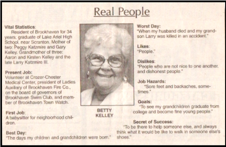 Betty was born in Lake Ariel, a small town in upstate Pennsylvania. After high school, Betty moved to the Brookhaven area for better employment, working at companies such as Fibre Metal and Scott Paper. Betty and her husband Bill moved to Brookhaven and raised their 2 children, Peggy and Gary on Coebourn Blvd.