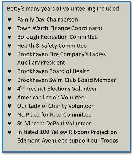 She was instrumental in the startup of Brookhaven’s Town Watch in 1995.