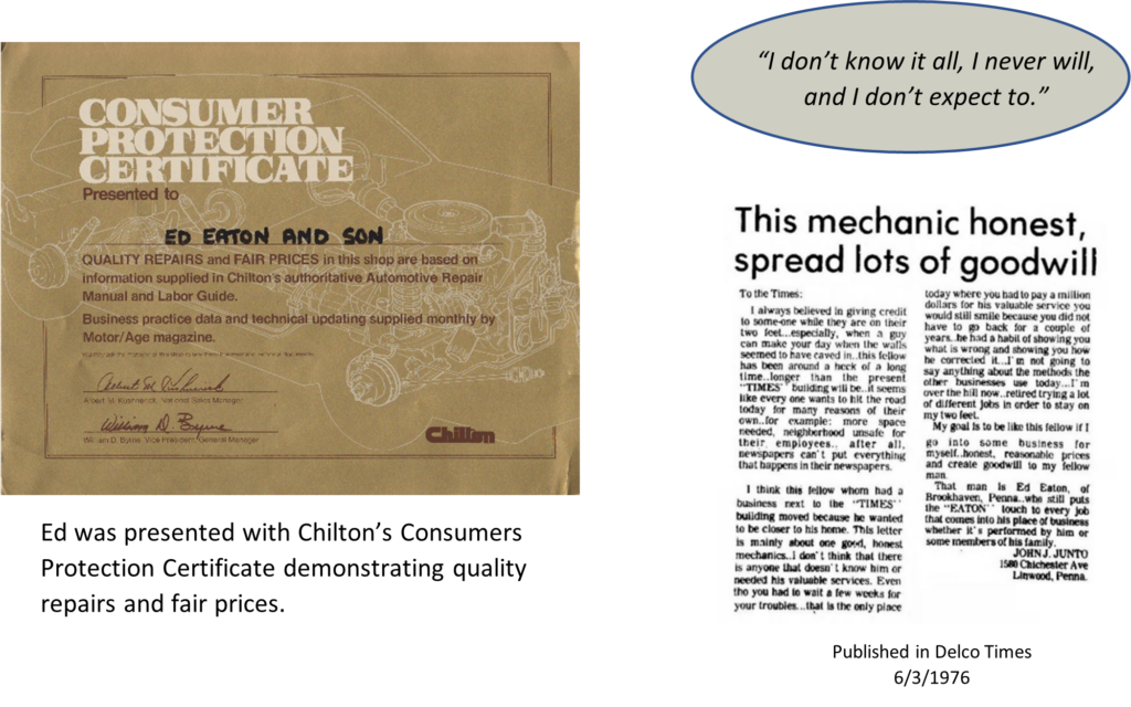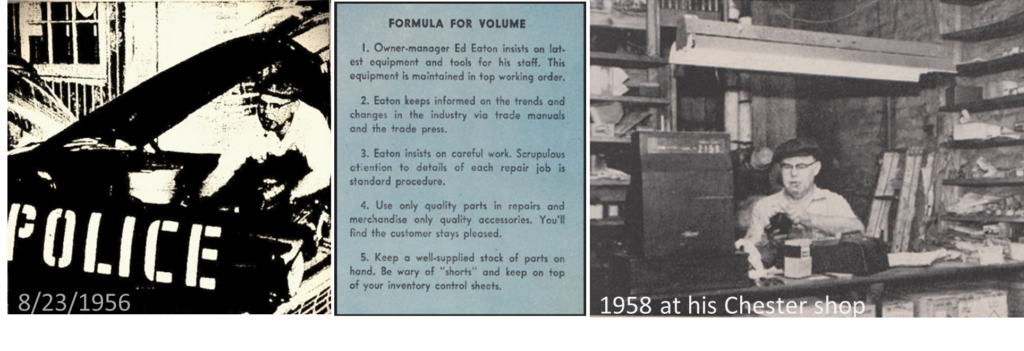 In the 1960s, Ed moved his auto repair shop, Ed Eaton Battery & Ignition from 805 Sproul St. in Chester to Edgmont & Wellington Avenues in Brookhaven until he sold it in the mid-1990s.