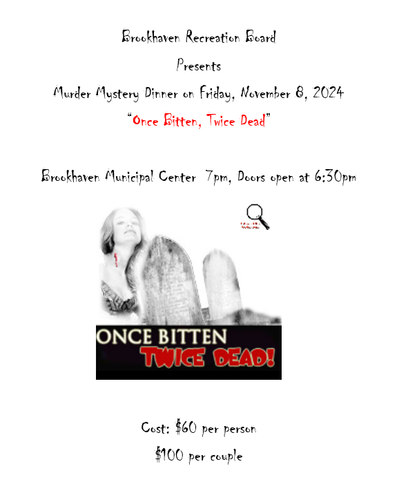 The Murder Mystery Dinner ‘Once Bitten, Twice Dead’ is fast approaching. This is an interactive play where audience members become actors in this “Who Done it” show. Come for the fun and laughs and entertainment.