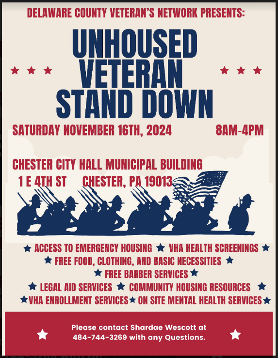 The Veterans Administration is hosting an Unhoused Veteran Stand Down on Saturday, November 16, 8am to 4pm at the Chester City Hall Muncipal Building.