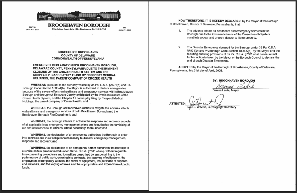 On Monday, April 21, 2025, the Mayor of Brookhaven declared an emergency for Brookhaven Borough due to the imminent closure of the Crozer Health System and the severe effects on healthcare and emergency services.