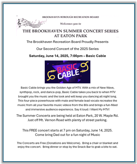 Brookhaven’s Summer Concert Series – RESCHEDULED: Basic Cable, Saturday, August 23, 7pm