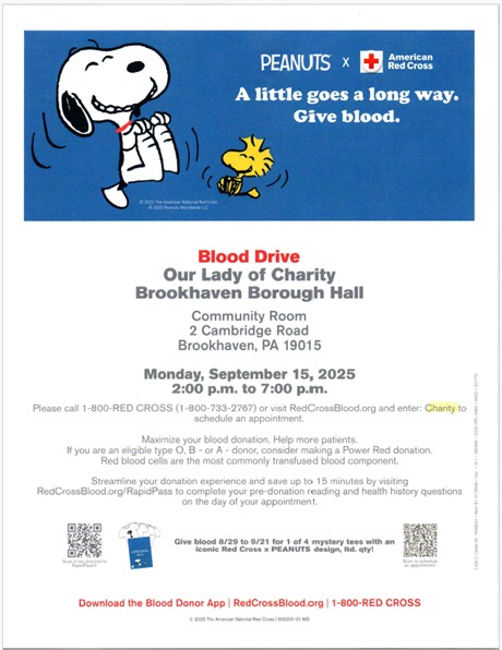 Blood Drive sponsored by Our Lady of Charity – 9/15/25