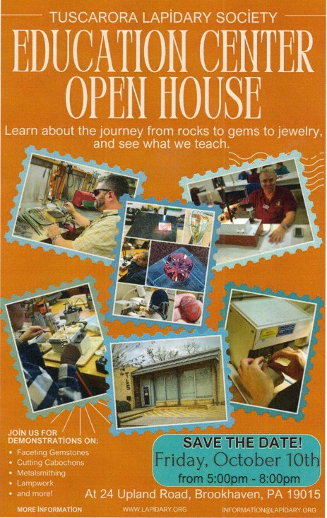 If you want to learn more about what the Tuscarora Lapidary Society does, come to their Open House on Friday, October 10th, 5-8pm for demonstrations and guided tours to see stone and gem cutting, jewelry making, glass bead making, and related arts and sciences. They teach the journey from rocks to gems to jewelry.