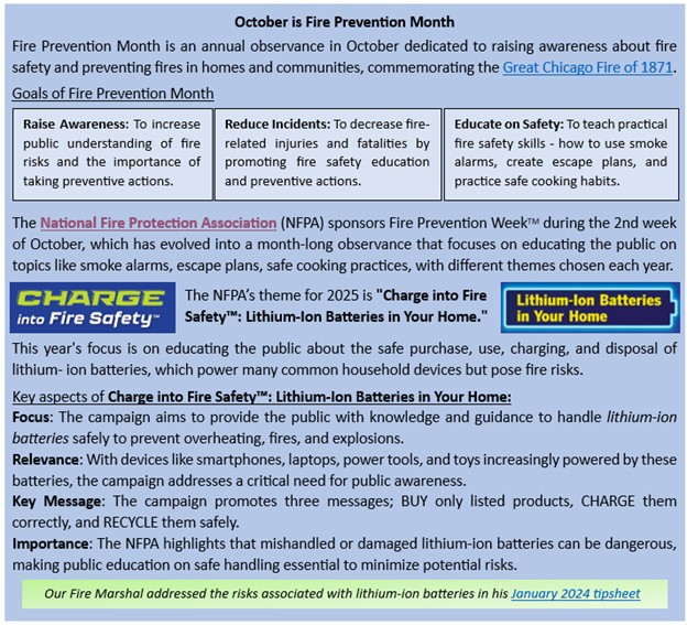 The NFPA’s theme for 2025 is “Charge into Fire Safety™: Lithium-Ion Batteries in Your Home.”