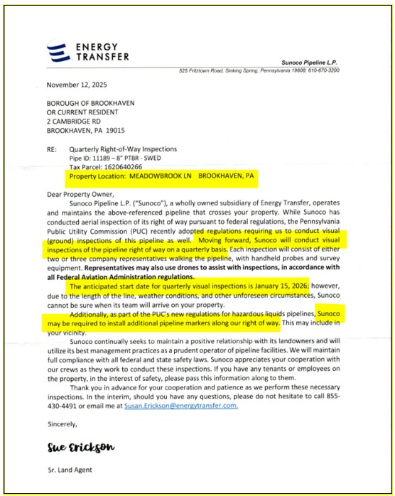 The Pennsylvania Utility Commisson (PUC) adopted regulations requiring visual ground inspections of the pipeline. Sunoco will begin to start these quarterly visual inspections starting January 15, 2026. This is in addition to the current Federal regulation of aerial inspections.