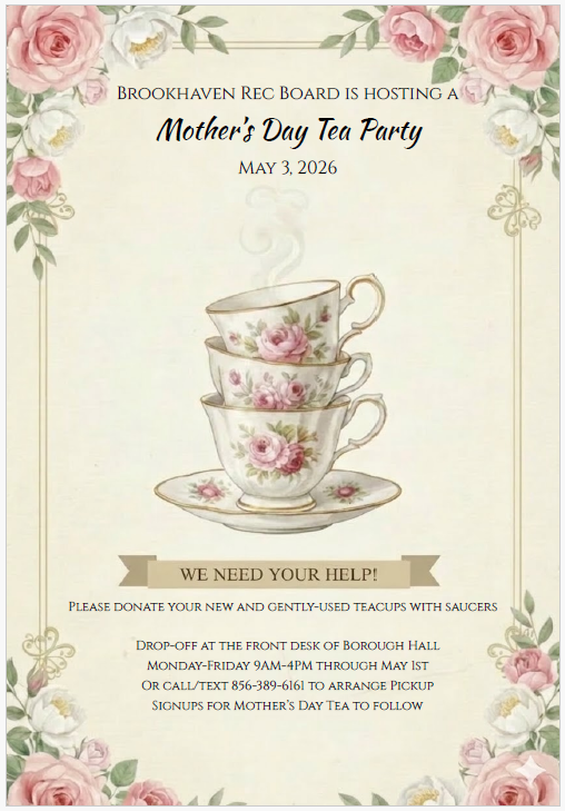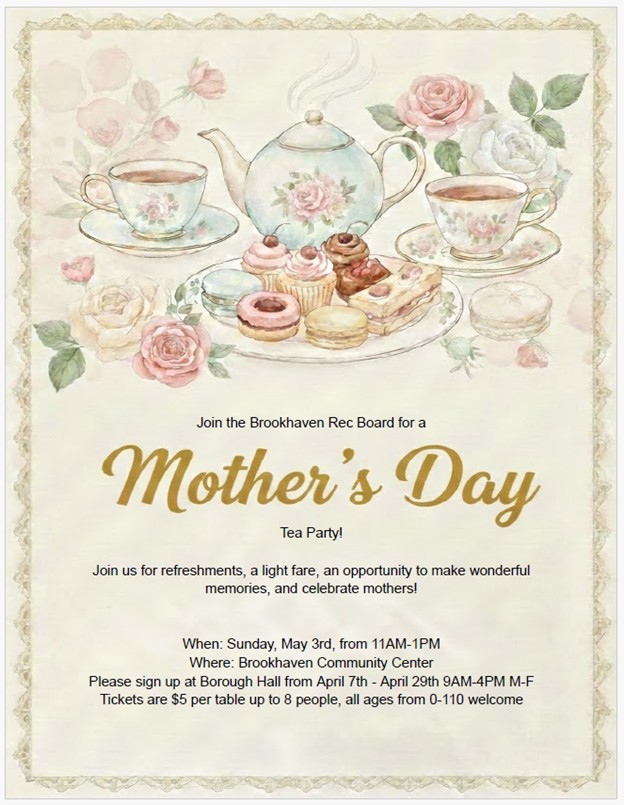 The Brookhaven Rec Board is throwing a Mother’s Day Tea Party to celebrate all mothers, grandmothers, and mother figures.