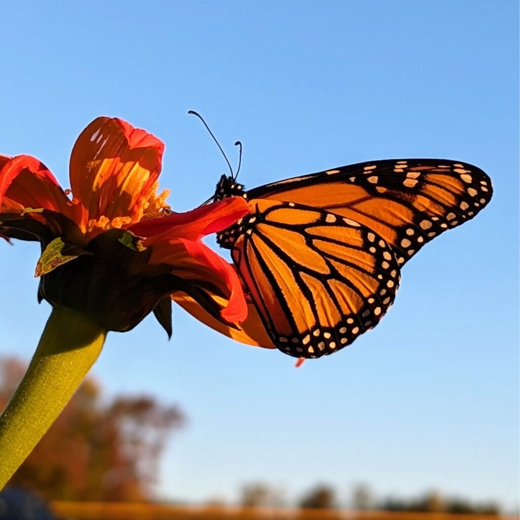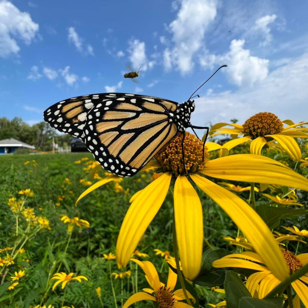 The sanctuary enhances the butterfly species, and other pollenating species, including endangered Monarch Butterflies that are flourishing within the sanctuary. With two dedicated milkweed beds, Monarchs have a place to lay their eggs, which become caterpillars. The caterpillars are collected and raised in an enclosure that keeps them safe from predators. Upon their emergence from chrysalis, they are then released back into the sanctuary. As of the summer of 2024, volunteers have harvested over 300 caterpillars.