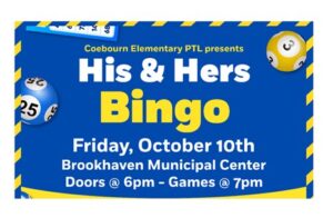 His & Hers Bingo, Brookhaven Municipal Center Gym. Doors open 6pm; game starts at 7pm.